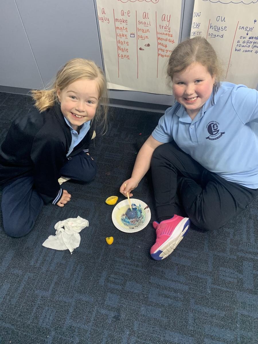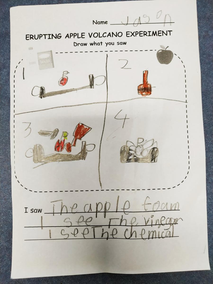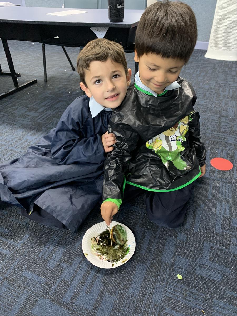 Our preps saw how the colours of lollies spread in a plate of water, and learnt about chemical reactions when their apple volcano exploded! They learnt to make predictions about what they thought would happen.