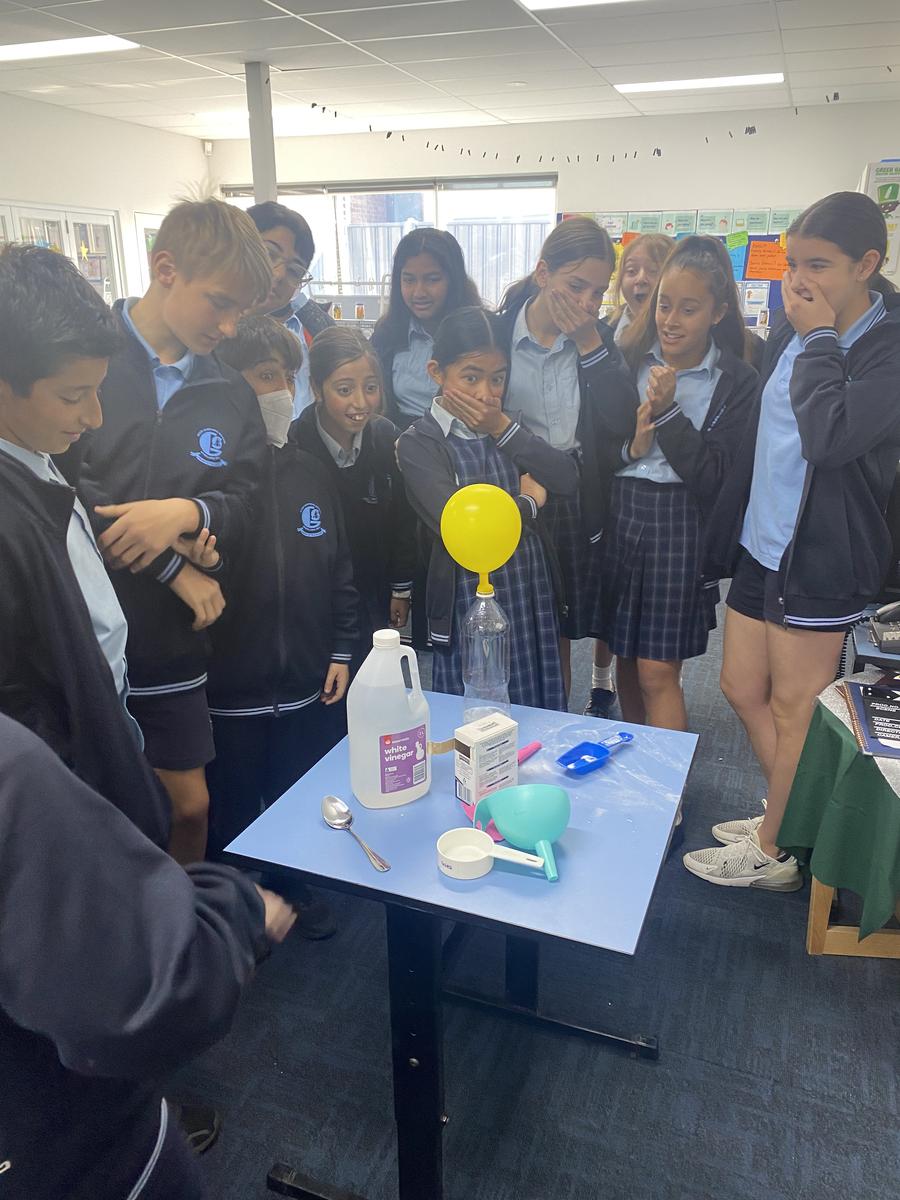 6 Hall also performed a chemistry experiment exploring the relationship between bicarbonate soda and white vinegar, by attempting to inflate a balloon using a plastic bottle. The students were all successful in doing this and were amazed by the result of the chemical reaction. Science Week was so much fun!