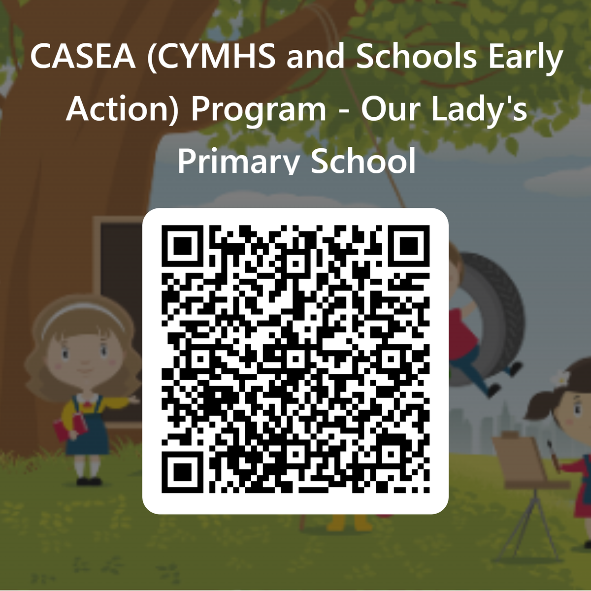 Below you will see a QR code that will take you to a short survey. We would like as many parents/carers as possible to participate in this survey to provide feedback to the CASEA team around any support that you would like to receive while we are at your school. We encourage parents and carers to talk with their child’s classroom teacher if they have any further questions about their child’s involvement in theCASEA activities. Parents are also welcome to contact the CASEA team on02 6051 7900.