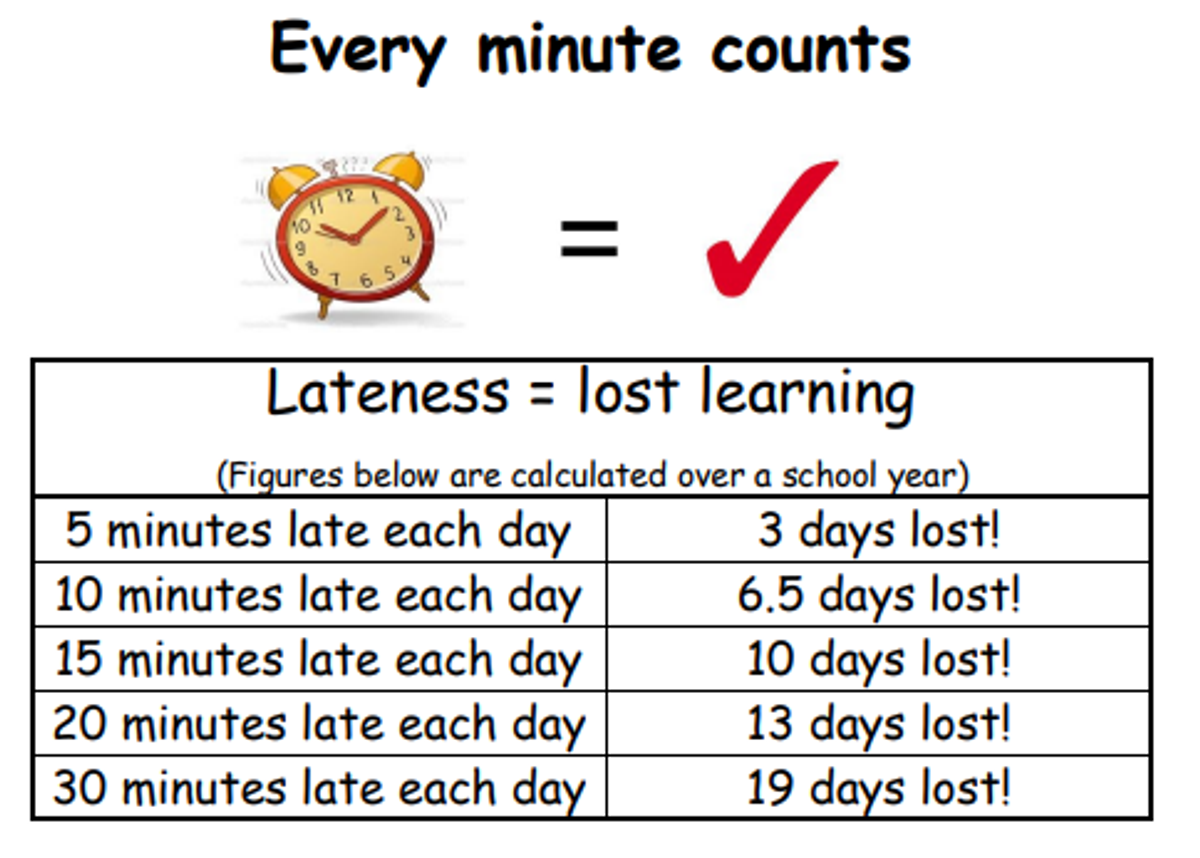 It is really important that students arrive at school on time each day (see graphic below to see the accumulative loss of time if consistently late).