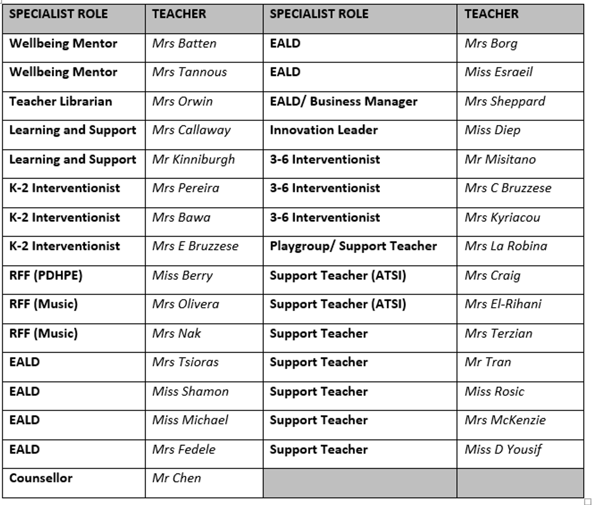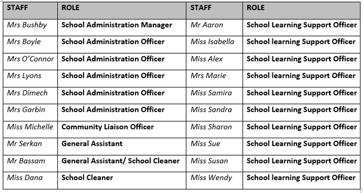An important part of our school is our highly valued staff that work in the office, in classrooms, taking care of the school grounds and generally making sure that everyone in our school is well looked after.
