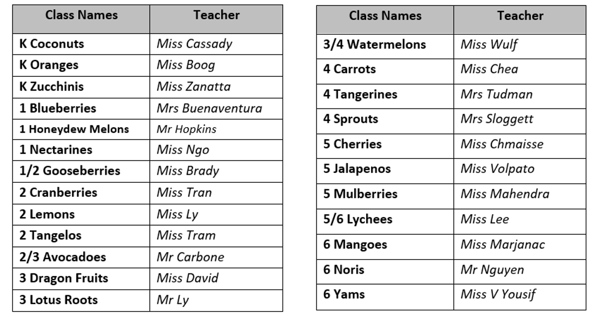 This year our classes are named after Fruits and Vegetables. This theme has been selected to coincide with the International Year of Fruits and Vegetables. When writing your child’s name for different things you can still use the initial of the class. For example, Miss Chmaisse’s class is called 5 Cherries. You can still write 5C. Children will be learning about their classes fruit or vegetables throughout the year.