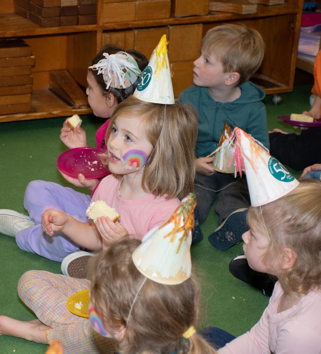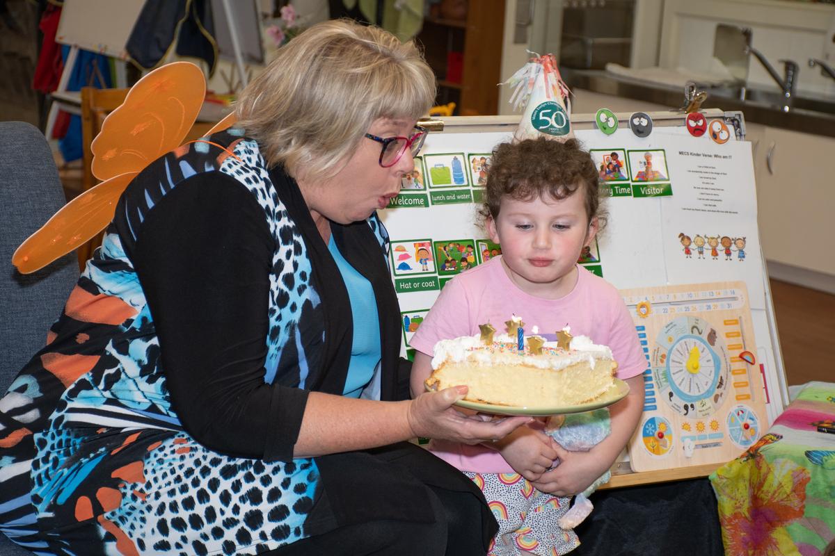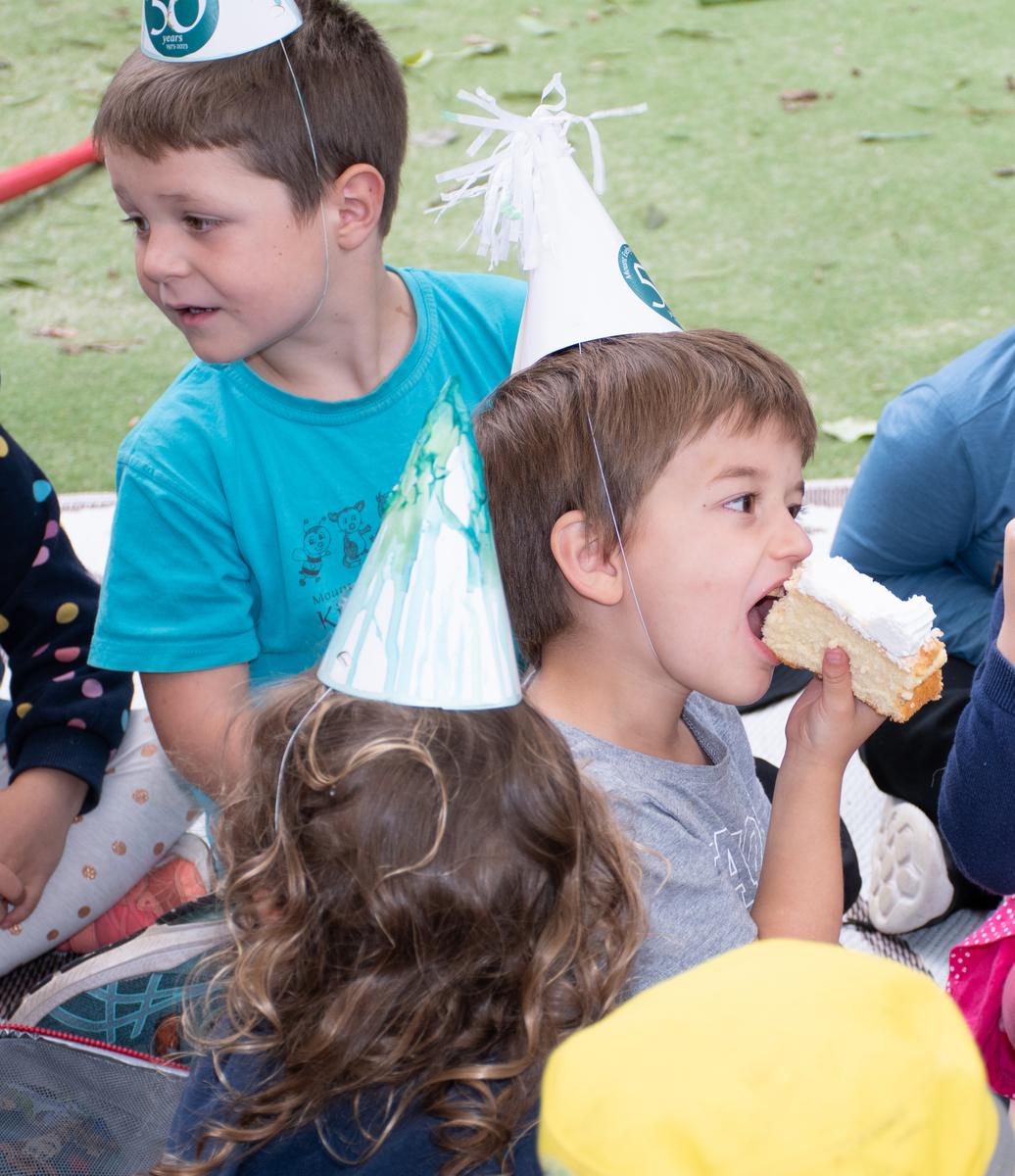 Our celebration day with Koala and Possum children started with a look at the animal farm – the children were thrilled to feed, brush and pat the gorgeous animals! Over the week the children have decorated a party hat and a tote bag as a special memory of this special occasion. Finally it was time to put our party hats on, 5 candles on the cake represented 50, and Mrs Sketcher came to sing Happy Birthday to MECS with us. Afterwards we all enjoyed eating cake, yum.