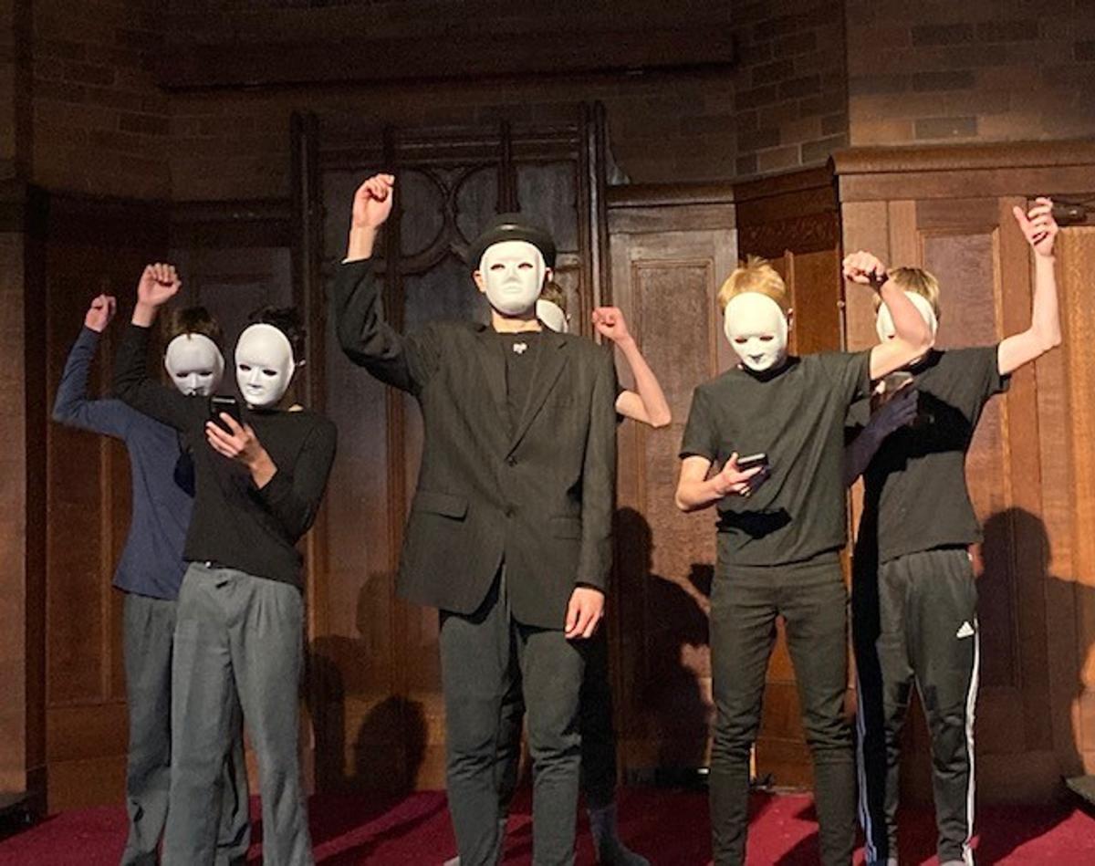 This term students in Elective Drama students: Year 9 have been learning about Greek Theatre and how the chorus works together through movement. Students were given the task of creating a contemporary chorus routine with a narrative storyline but told through the techniques of chorus. Two groups wrote, devised and performed their short plays for a group of Year 6 students and staff. One group recreated the events of the Titanic, including the iceberg itself. The other group explored our addiction to our smart phones and how dissenting voices create tension in society – they chose to wear masks to enhance the uniformity of society.