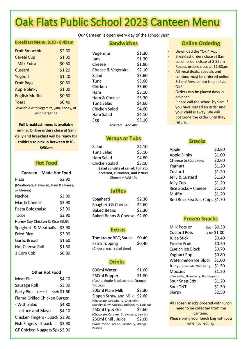 Our Canteen menu has been reviewed with an increase of 10c to items (excluding fruit) due to increased supply costs.