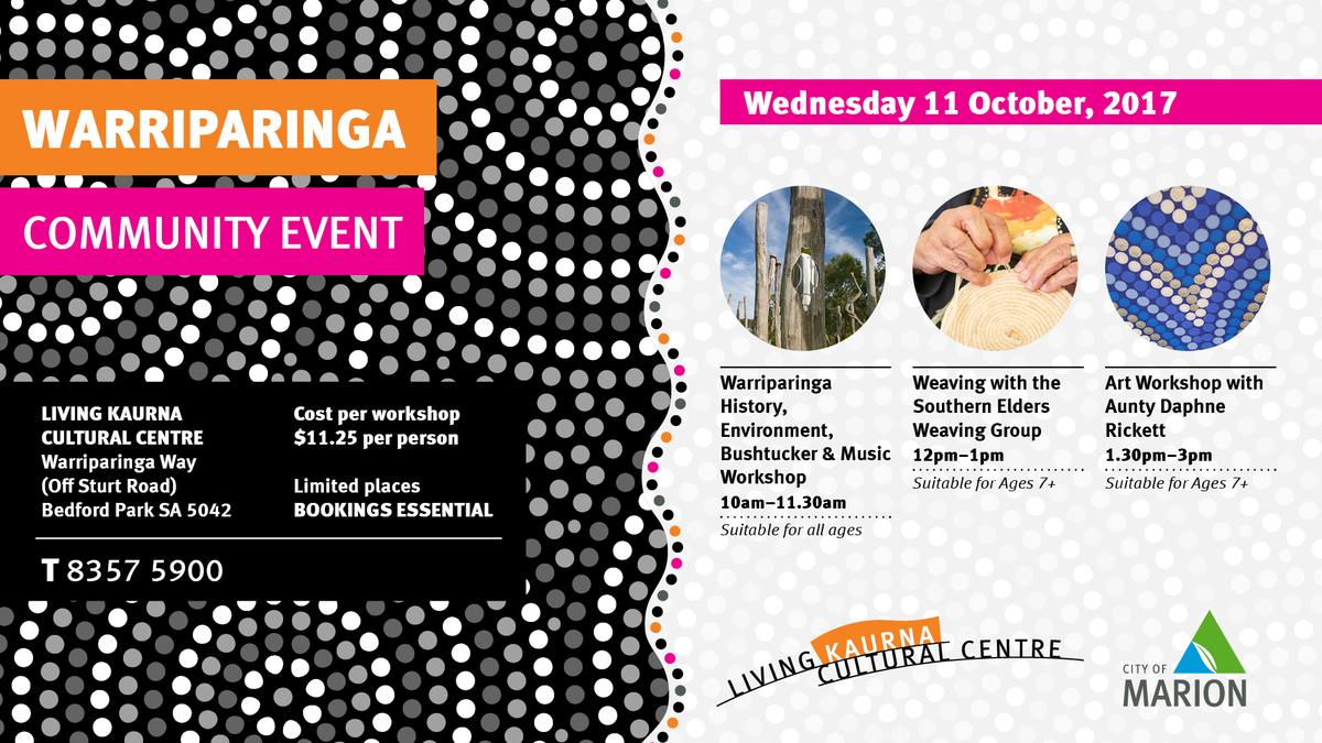 The Living Kaurna Cultural Centre at Warriparinga are having a workshop day on Wednesday 11th October 2017.