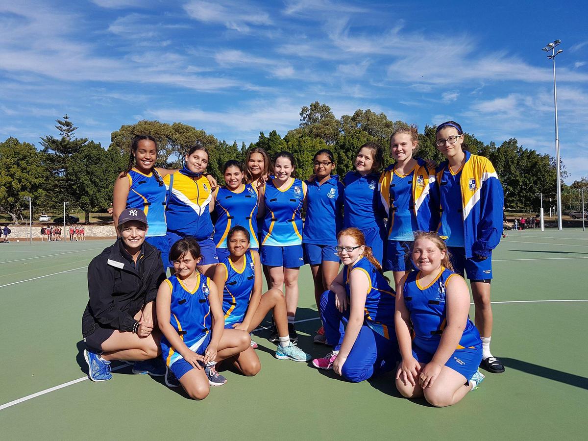 The Year 9/10 girls played exceptionally throughout the whole day only losing one game to Mandurah Catholic College, who were last year’s Grand Final winners. The defence applied fantastic pressure to the opposition attacking line with amazing deflections and rebounds, thanks to Grace White, Anushka Kotian and Suzanne Vagg-Johnson. Our attack was unstoppable, with Shenae and Kayla Hartree, and Erin Roch shooting goals from all around the shooting area. Zeta Stevens, Courtney Fitzgerald, Lauren Verbiest, Caitlin Bransby, Jade Greewell and Teyan Hodgson all stood up against some very tall opposition in centre court.