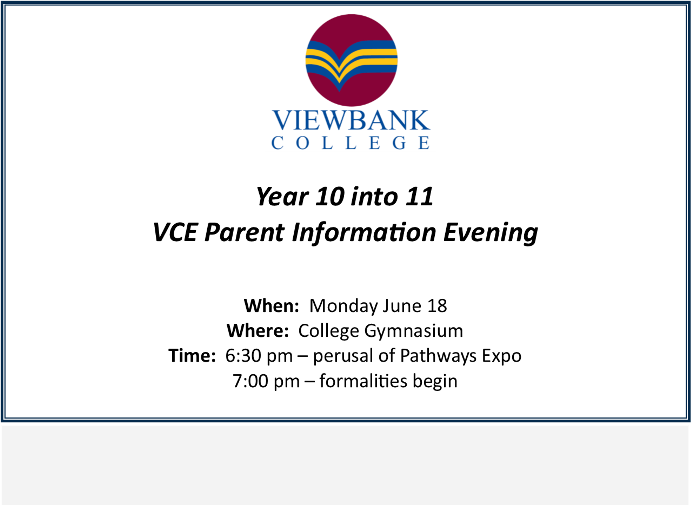 - Yr 10 into 11 (VCE) Parent Information Evening – June 18