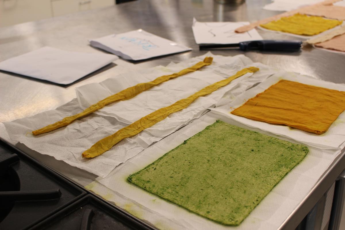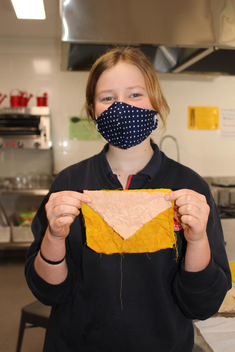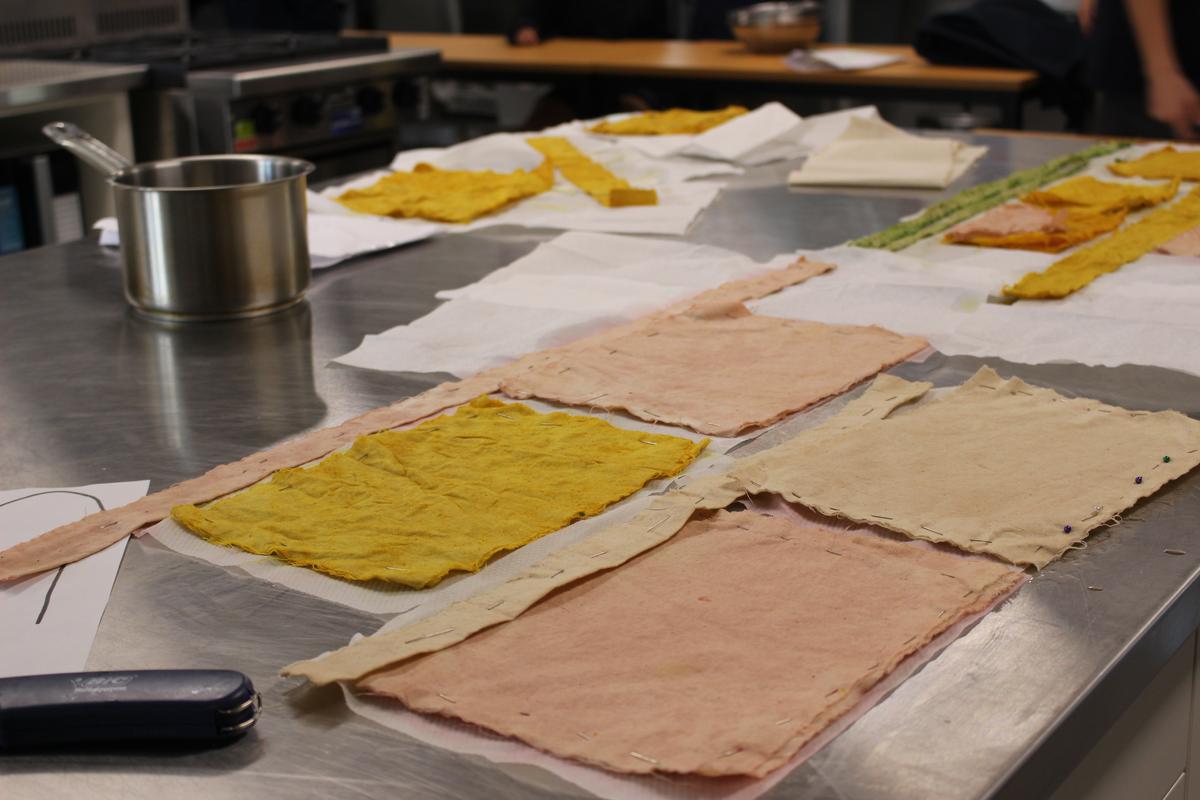 The students pictured are using natural ingredients to dye their fabrics in a variety of colours. Some groups used red cabbage and bicarb to produce blue, another group used turmeric to produce orange. As you can see, different vegetables/spices worked better than others, but in the end, everyone managed to dye their fabrics.