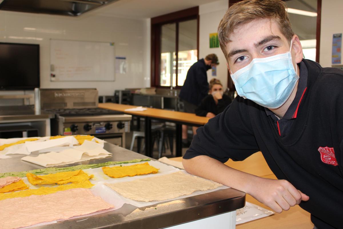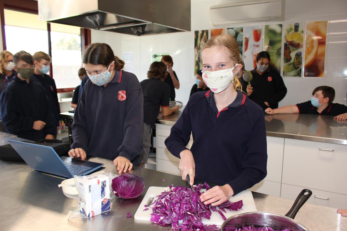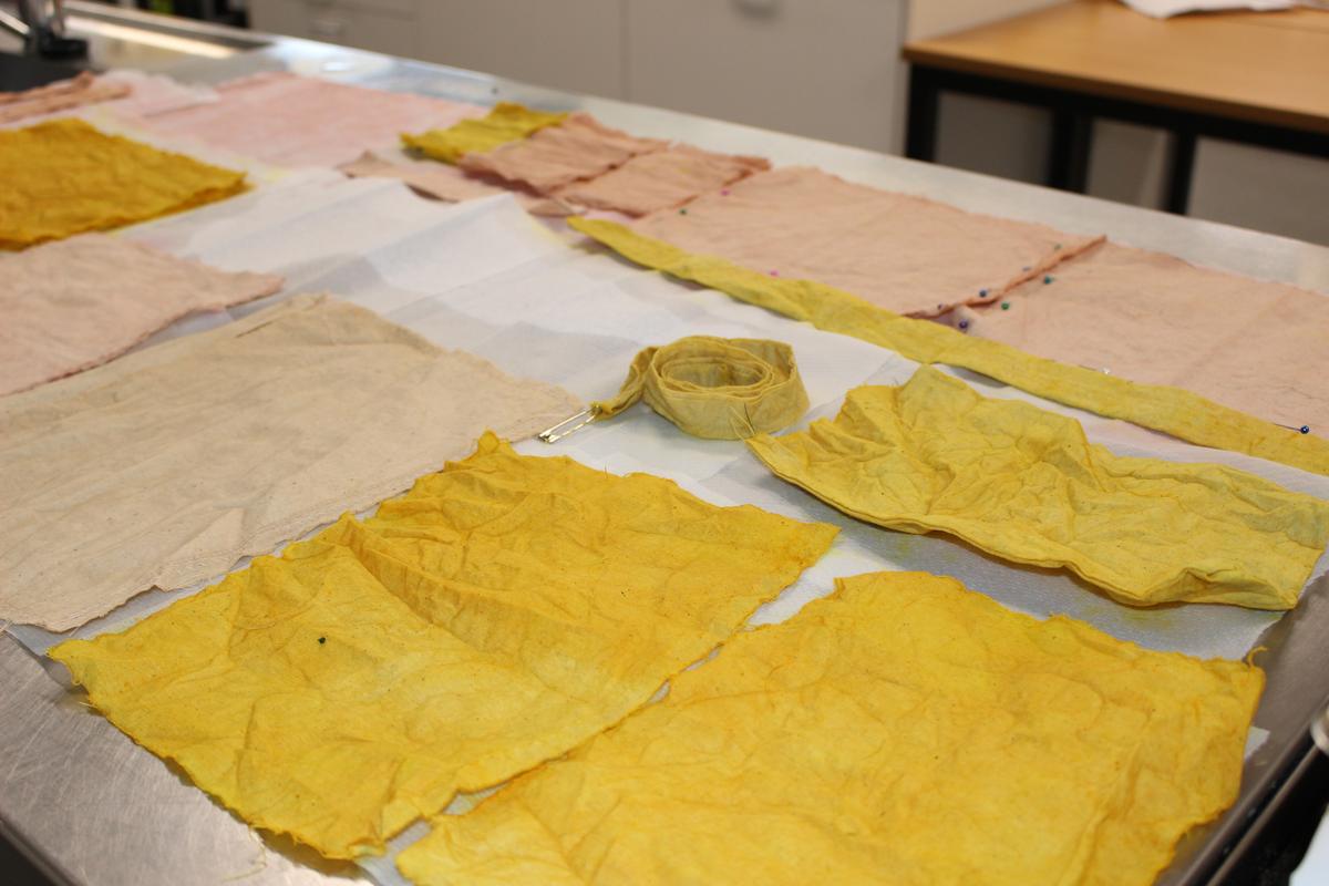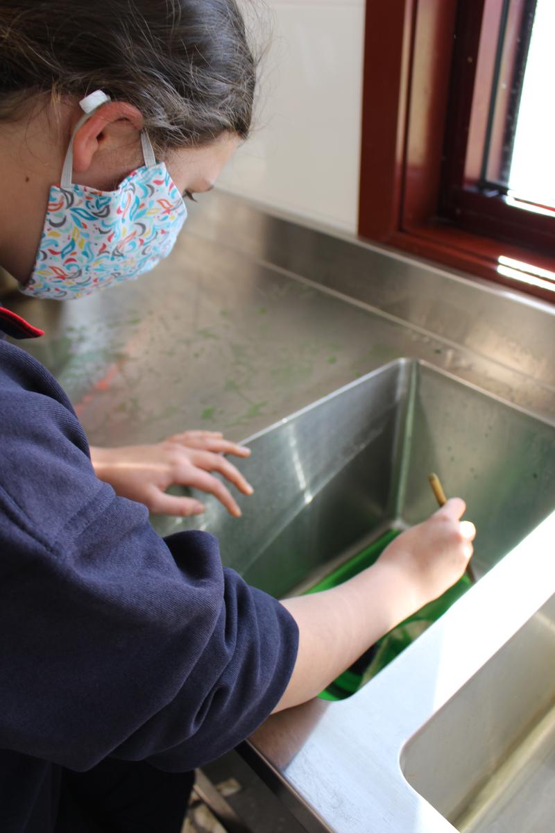 The students pictured are using natural ingredients to dye their fabrics in a variety of colours. Some groups used red cabbage and bicarb to produce blue, another group used turmeric to produce orange. As you can see, different vegetables/spices worked better than others, but in the end, everyone managed to dye their fabrics.