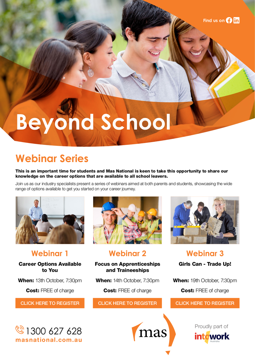 Mas National specialise in connecting young people with work opportunies via apprenticeships and training programs. See the flyer for details of their upcoming free webinars. To register and find further information check out masnational.com.au and the links below.