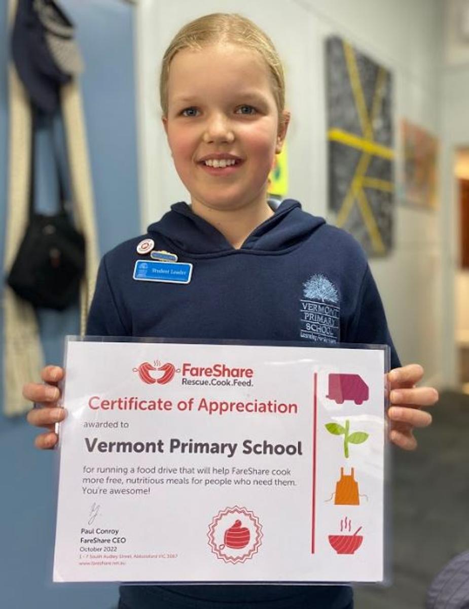 FareShare have awarded Vermont Primary School a certificate of appreciation that will be displayed in the front office.