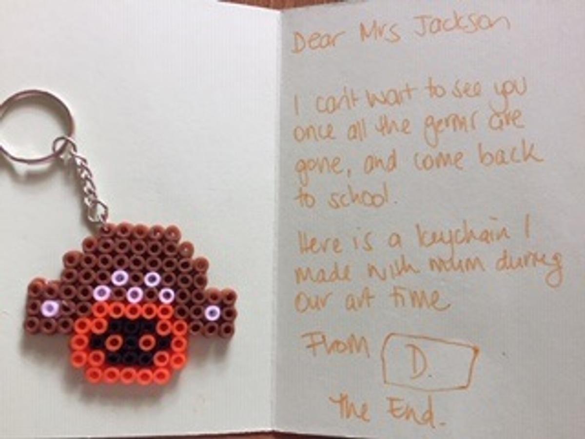 Young Dathan (JJAC) clearly wants to be in his classroom. He writes to his teacher Monica Jackson "Dear Mrs Jackson, I can't wait to see you once the germs are gone and come back to school. Here is a keychain I made with mum during our time. From D. The end."
