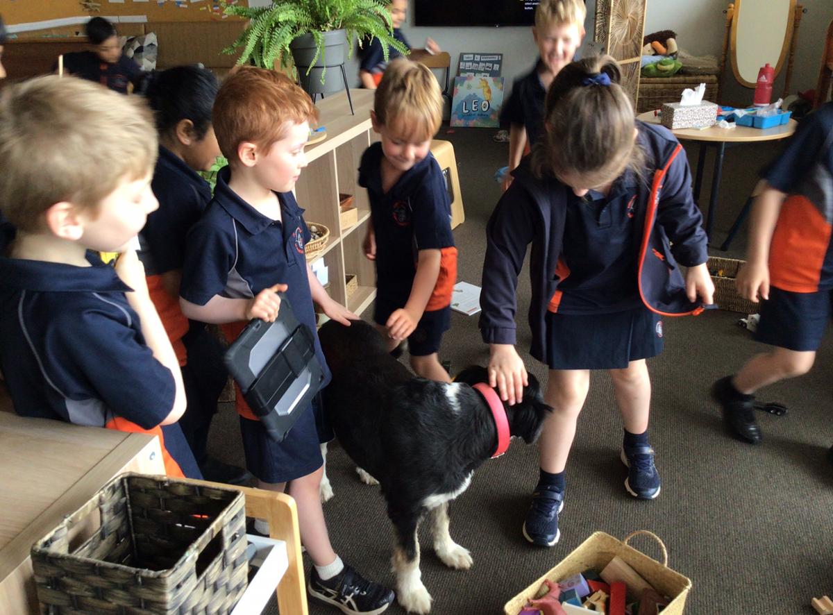 In 2019 Zephyr transferred to St Anne’s College and became an inaugural staff member, complete with her own school identification tag! Stopping at the traffic lights at the corner of the Goulburn Valley Highway and Sanctuary Drive she would promptly sit up in the front passenger seat knowing that she was only minutes from school. Zephyr would then pull hard at her lead across the car park, desperate to get inside and greet everyone. She was readily accepted and quickly settled into her routine of wandering around and tapping students with a paw to get a pat. Zephyr loved being with our students and it wasn’t unusual to see up to six Foundation students holding her lead as she wandered around.