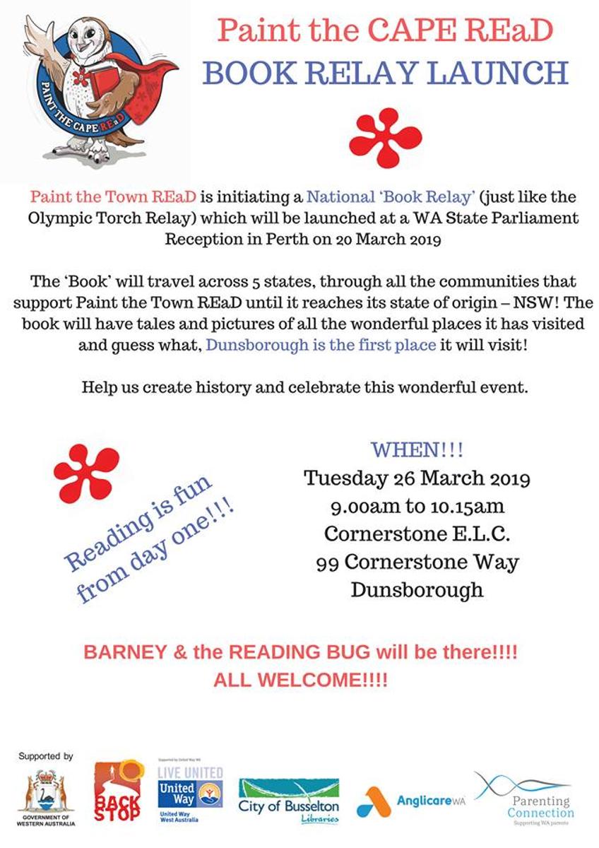 On Tuesday, VIPs, media and students from Cornerstone will launch a Nationwide event - the Reading Relay. A book will be created as it travels around the country, with each school it visits having the opportunity for a student to sign a page as a marker of its journey. Cornerstone Dunsborough has been selected to be the very first page, and we are delighted that Saxon Trigwell is going to sign it for us. Saxon's selection is particularly relevant, as he has a condition called Verbal Dispraxia, which makes his participation very meaningful.