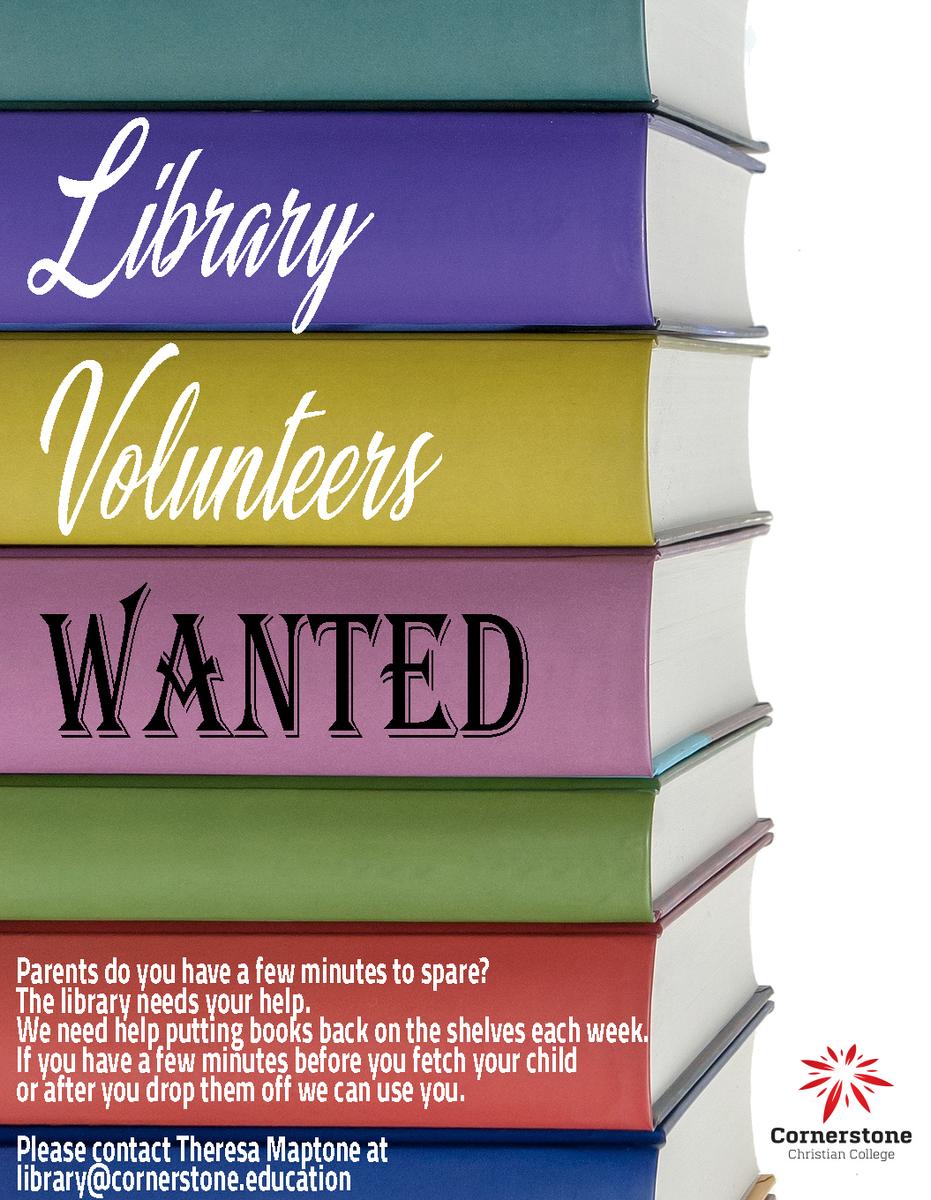 Parents do you have a few minutes to spare? The library needs your help. We need help putting books back on the shelves each week. If you have a few minutes before you fetch your child or after you drop them off we can use you. Please contact Theresa Maptone at library@cornerstone.education