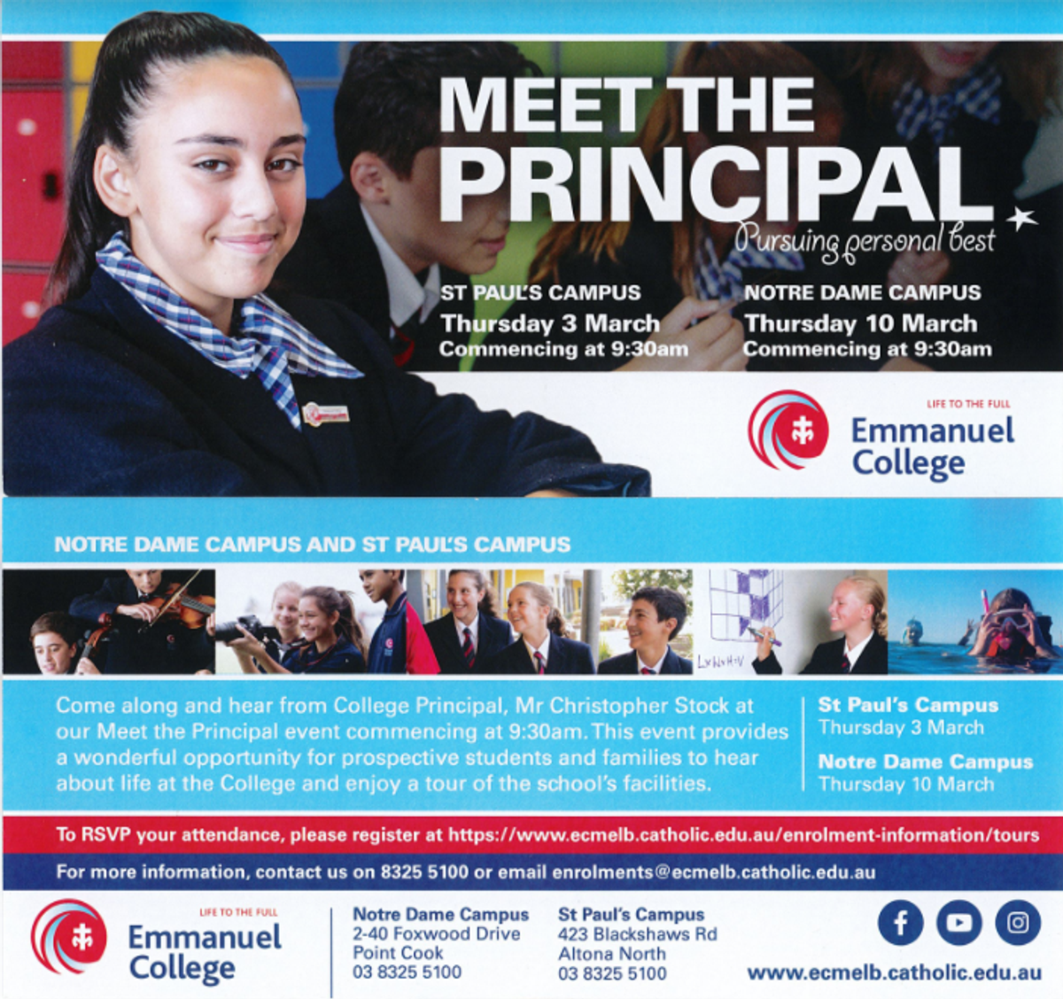 We are very excited to be hosting our two Meet the Principal experiences in coming weeks. Bookings are essential and can be made by clicking on the Tours and Events tab on the right hand side of the College webpage, www.ecmelb.catholic.edu.au