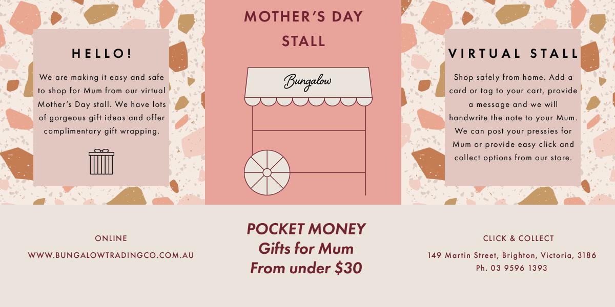 Anna from Bungalow, a gorgeous store with interesting and beautiful fashion, gifts and homewares, is holding a virtual Mother’s Day Stall and is offering the Kilvington community 10% off purchases until midnight Saturday 9 May.