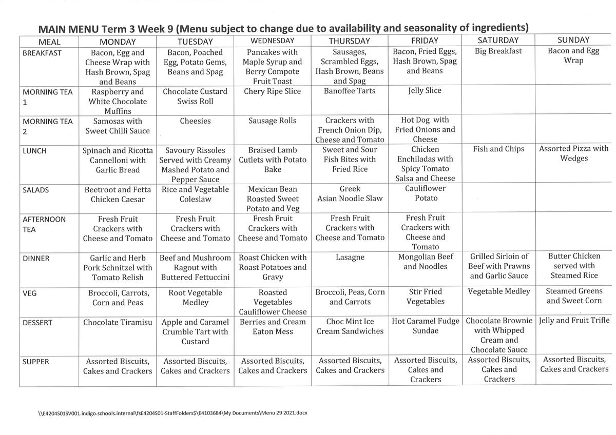 Thankyou to those Year 12 parents who completed the online survey recently. We also surveyed all Year 12 students and will work through the responses. (The Year 10 and 11 students, along with their parents will be asked to complete next term). One of the things that stood out to me in the student responses was their view about the food on offer. This surprised me as I observe a wide range of foods on offer catering for lots of tastes and still adhering to healthy eating principles. The menus are on a five week rotation and I know that in my own house and probably most others, there is not the same degree of variation. Below is the current week menu for your information.