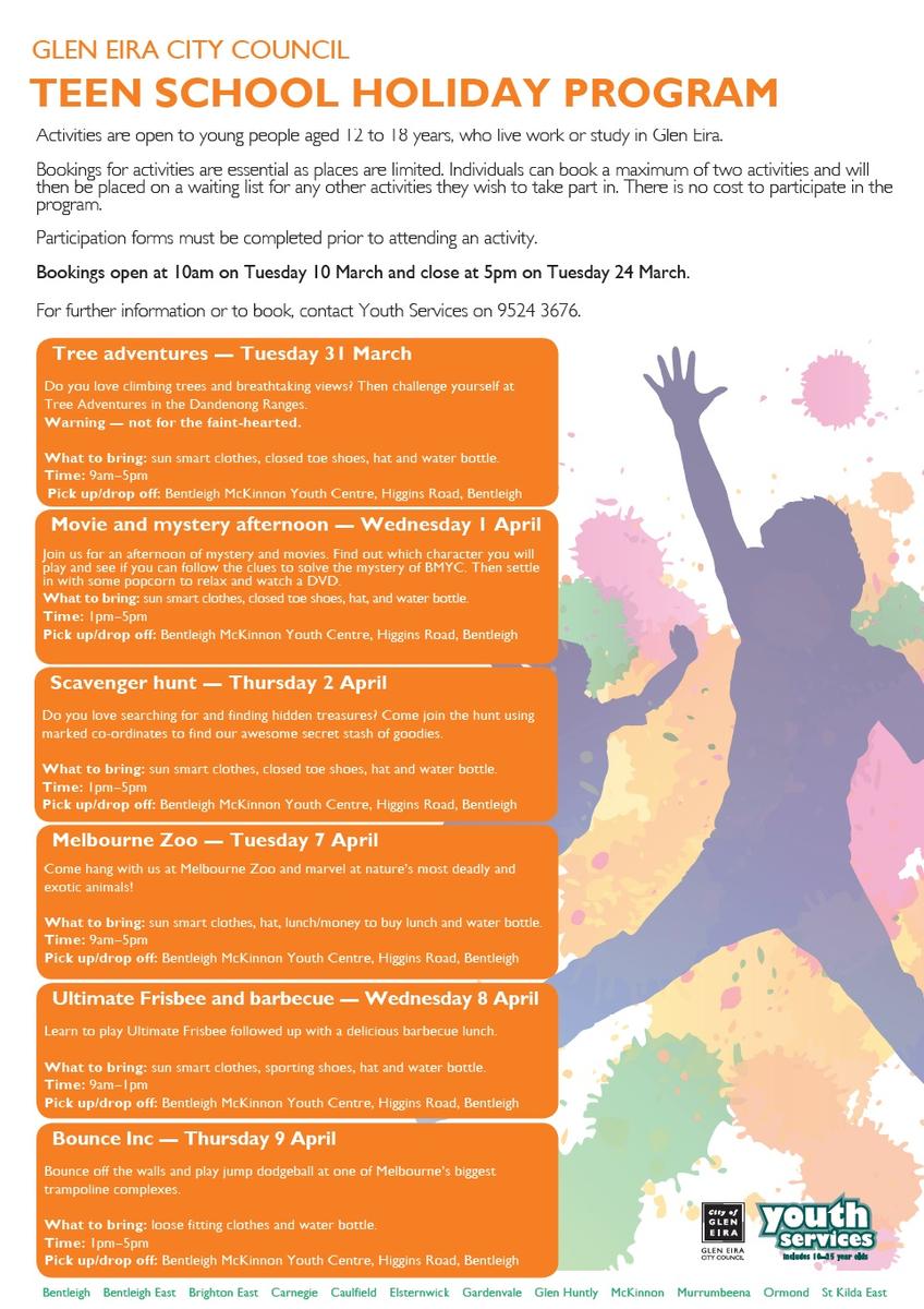 School holiday activities available for young people aged 12 – 18 years who live, work or study in the City of Glen Eira. Activities include high ropes obstacle course, scavenger hunts, the Melbourne Zoo, trampoline dodgeball at Bounce Inc and much more. Bookings are limited and are open from 10:00am from Tuesday 10 March. Please refer to the attached link for further information.