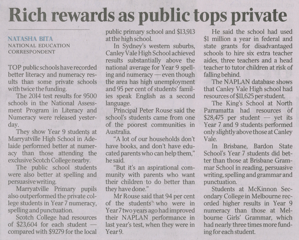 This article showcases excellence in public schools and names a number of these schools in Australia that outperform high cost private schools. The article can be found at the following link .