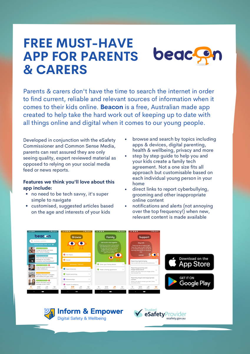 Beacon App is a free must-have app for parents and carers. It provides current and reliable information to assist parents and carers with supporting kids online.