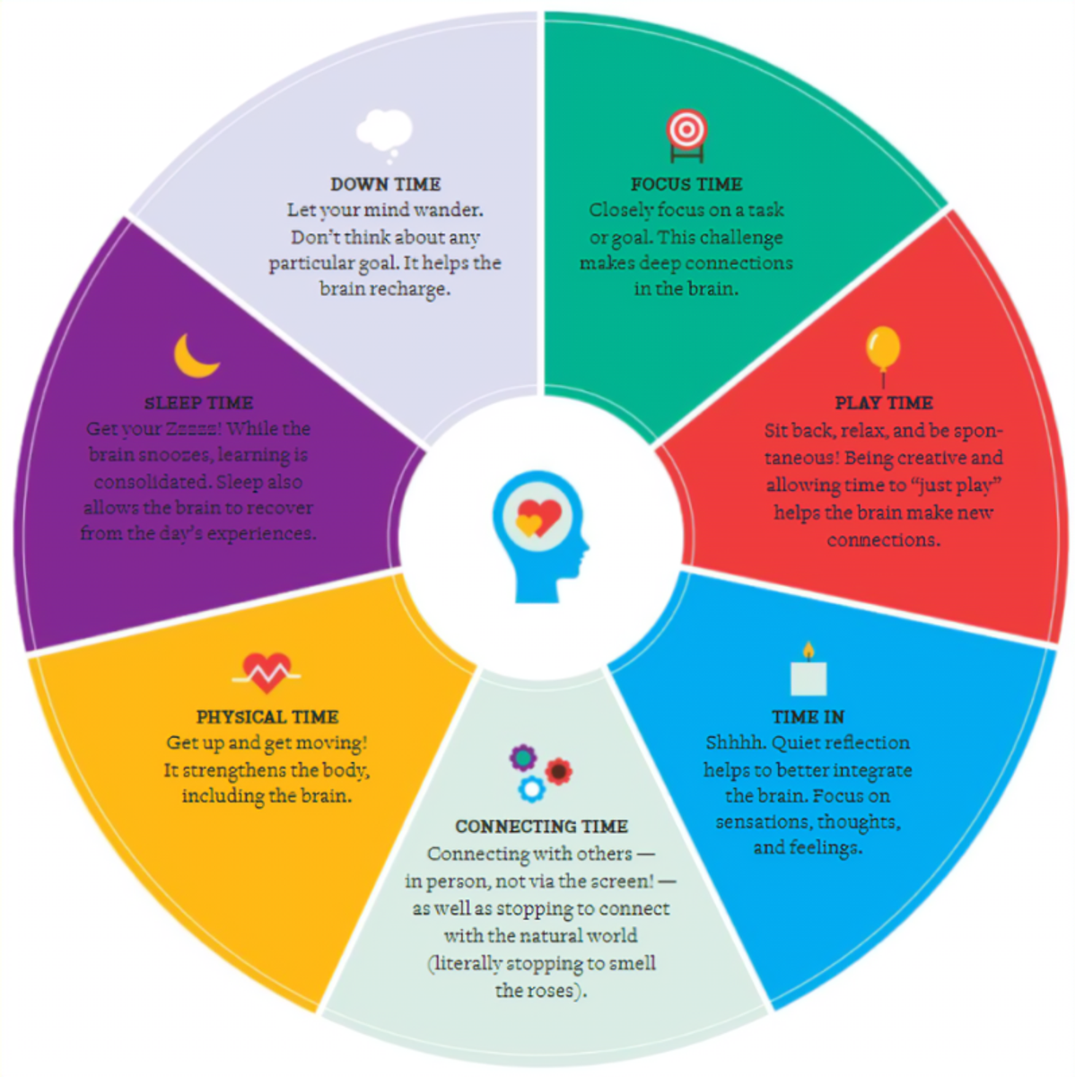 We heard a common message, reminding our students we are at our best when we invest in the health of our bodies, minds, and social relationships. Simply, it might be committing to an earlier bedtime or picking up some art supplies to set the creative juices flowing again. The aim is to fill our daily platter with the seven mind-food groups: Down Time, Focus Time, Connecting Time, Physical Time, Time In, and Sleep Time, and see if you notice greater balance and wellbeing in your body, mind, and relationships (Dr. Kimberly Langdon, M.D.,2018).