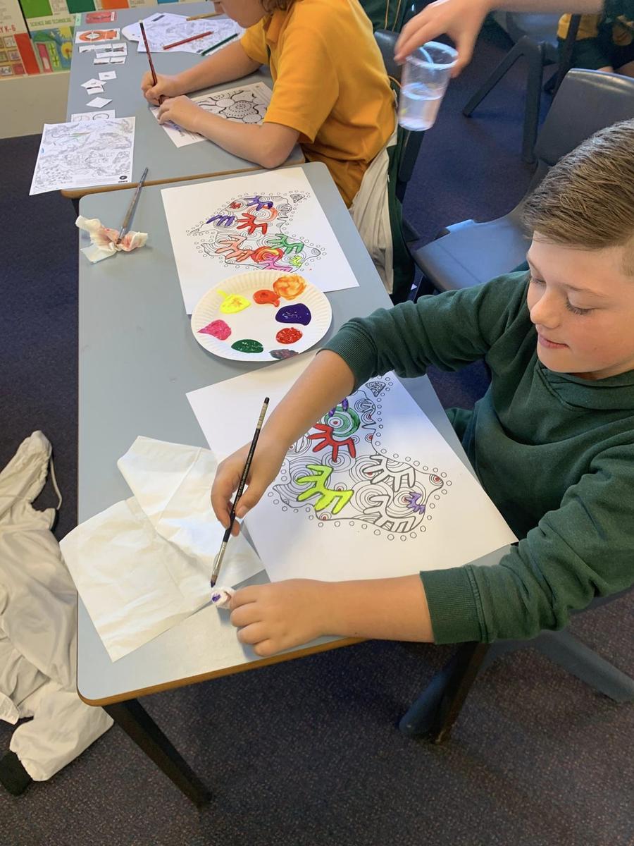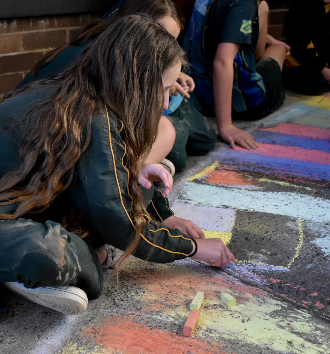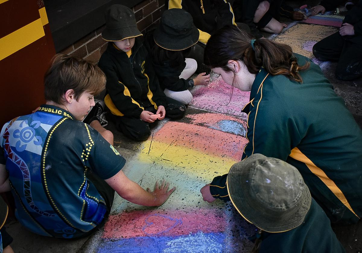 On Friday, students met with their buddy class to recreate a giant collaborative mural of Gurrungutch which wound its way through the school. They used chalk pastels to create designs using traditional Aboriginal and Torres Strait Islander symbols, as well as the shapes and patterns in our own Gurrungutch. It was great seeing our whole school sharing yarns and creating together.
